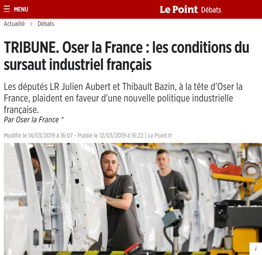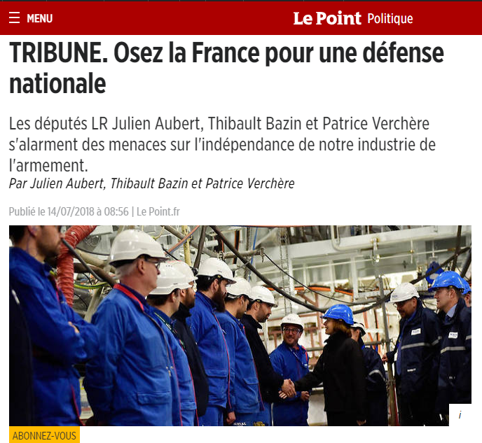 TRIBUNE. Osez la France pour une défense nationale Les députés LR Julien Aubert, Thibault Bazin et Patrice Verchère s'alarment des menaces sur l'indépendance de notre industrie de l'armement. 14/07/2018 à 08:56 Néanmoins, derrière la communication présidentielle, les chiffres sont têtus. Cette augmentation est à nuancer par la « clause de...